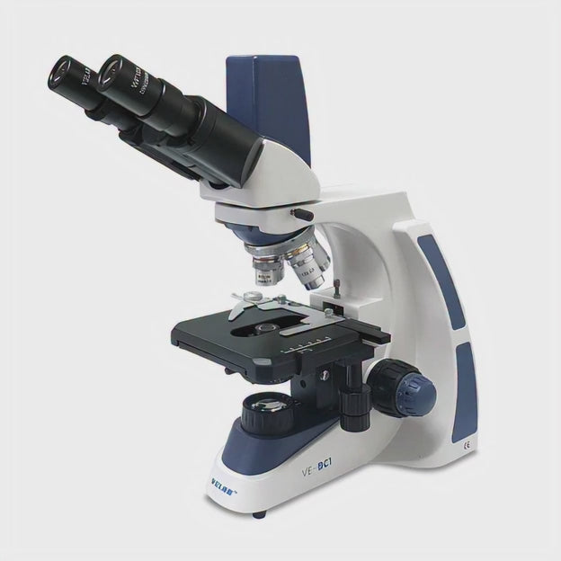 Microscopio binocular, cuenta con cámara integrada en el cabezal. Adecuado para laboratorios de diagnóstico.