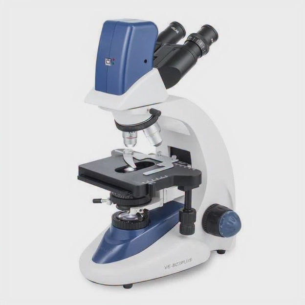 Microscopio binocular con cámara digital integrada en el cabezal. Adecuado para docencia en nivel medio superior, universidad, investigación básica y diagnóstico.
